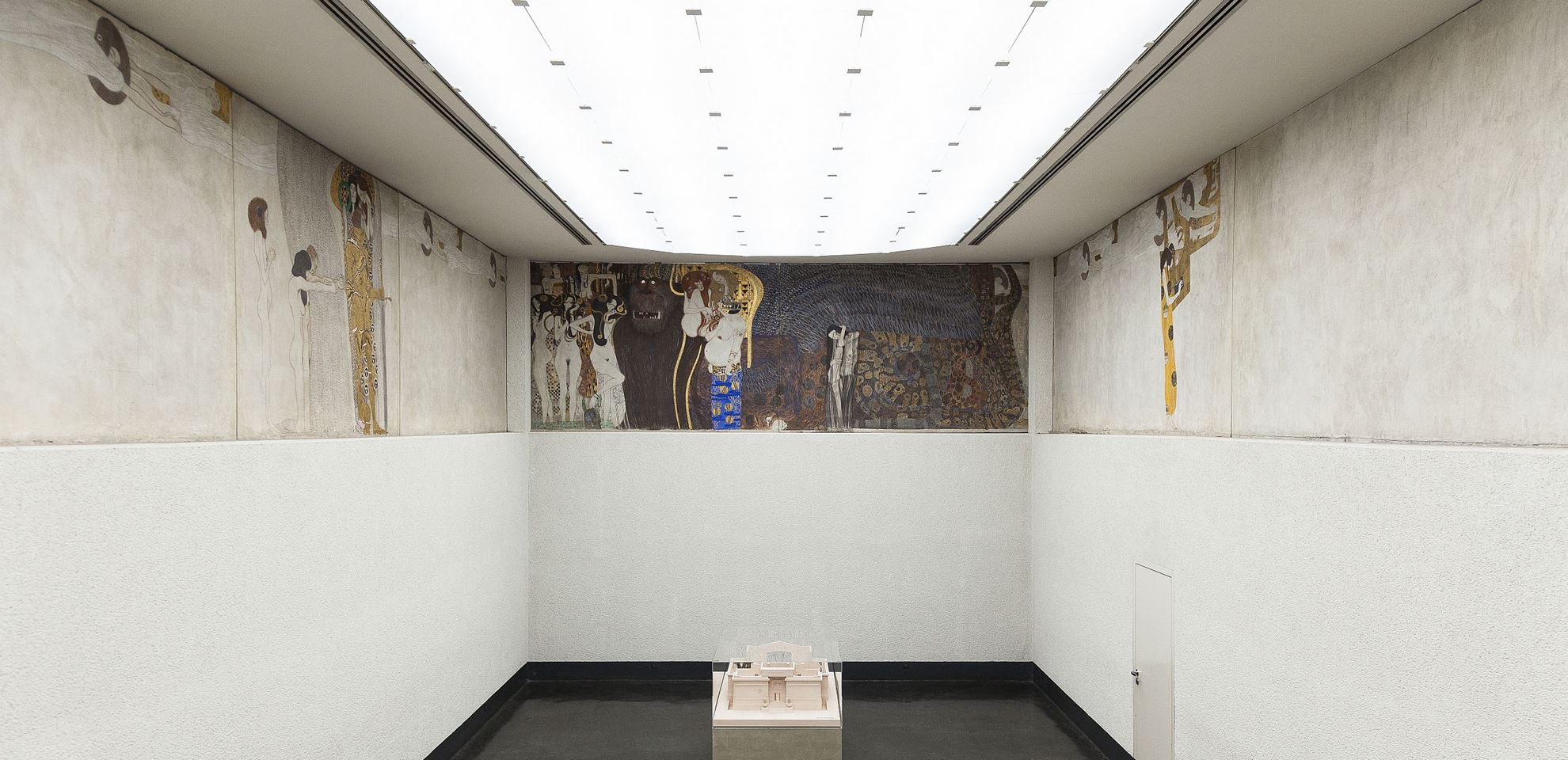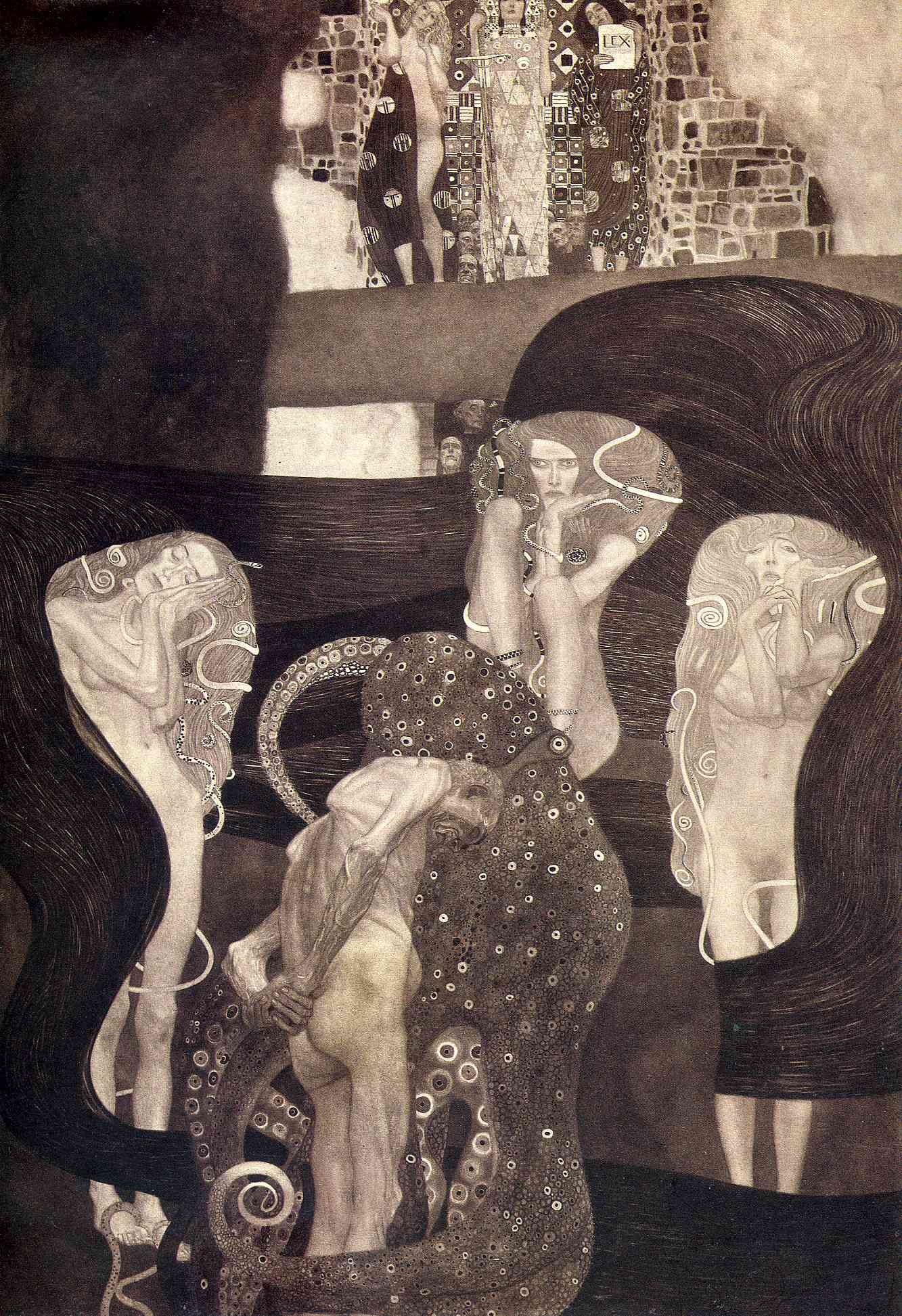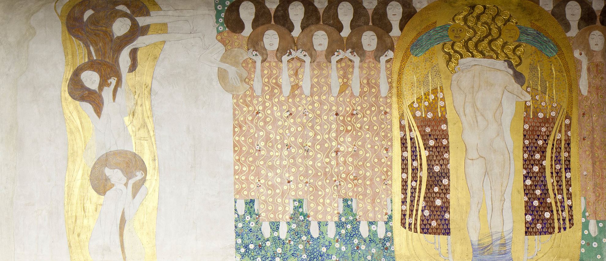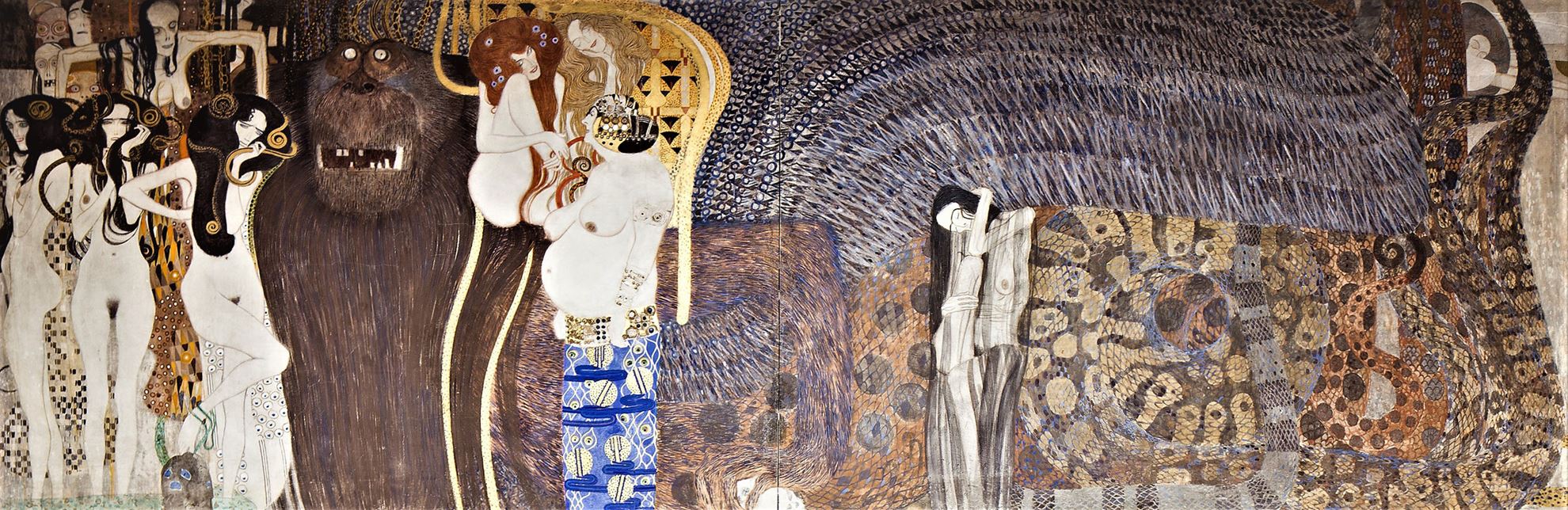 1902 was important for both the Secession group and Klimt. The Beethoven exhibition was held in the Sezession Palace. The exhibition was the celebration of a single work by Max Klinger, a statue of the German composer. For this exhibition, Klimt created “The Beethoven Frieze” consisting of three gypsum panels. The three walls depicted were forming an array. The first long wall opposite the entrance was "The Yearning for Happiness", on the last wall was "The Hostile Forces" and on the second longwall "The Longing for Happiness Finds Repose in Poetry".