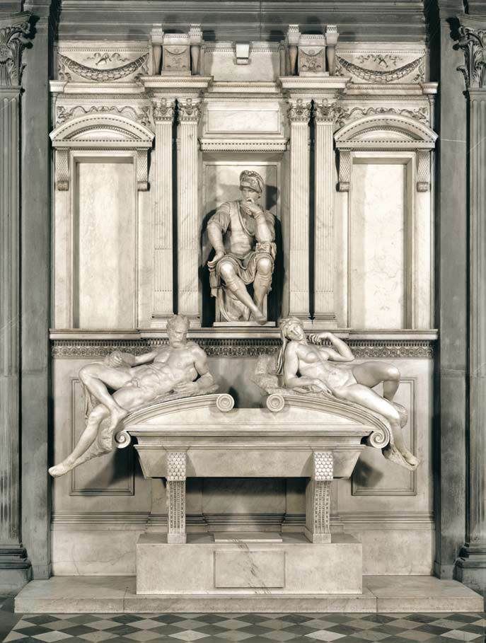 Michelangelo carried out his first architectural work in his hometown of Florence by order of the Papacy. In 1513, the Pope X.Leo elected was planning new arrangements for the Church of San Lorenzo with his successor, VII. Klemens. San Lorenzo Church was close to the palace of the Medicis. Michelangelo was first given the task of building the facade of the Church of San Lorenzo. The artist ceased construction of facade and started working on the tomb chapel and library of the Medicis church complex. The staircase project in the entrance hall of the library was completed by architect Bartolomeo Ammannati in accordance with the design of Michelangelo. For the other members of the Medici family, the construction of the New Cemetery was planned in front of the Old Cemetery in San Lorenzo. On the sidewalls, the graves of Lorenzo de’Medici and his brother Giuliano Dei Medici were made. The graves of Lorenzo and Giuliano were opposite each other. In the tomb, there were figures of Lorenzo and Giuliano and two female and two male figures representing the four times of the day as on the sarcophagus. On the tomb of Giuliano, in the Night and the Daytime, Lorenzo's tomb had figures representing Dawn and Evening. The center of the grave complex was "Medici Madonna". Just like Michelangelo's many works, the New Cemetery could not be completed.