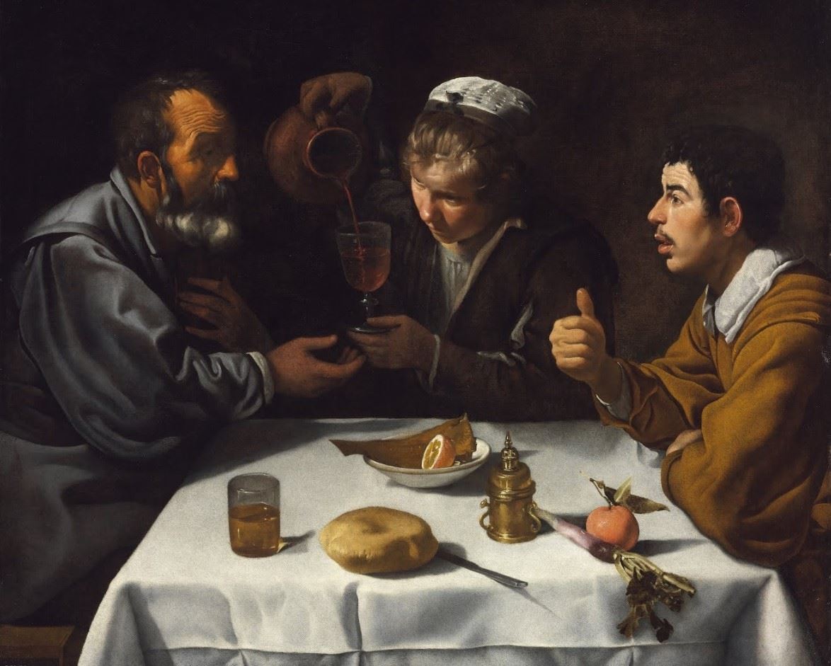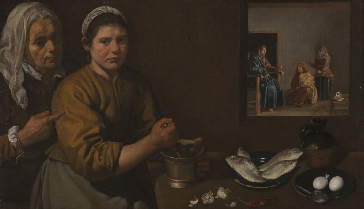 Velázquez’in ilk eserleri İspanya’da bodegón tarzda resimlerdi. Bodegón meyhanede içki içenler, ocak başında yemek pişiren kadınlar, sokak satıcıları, çalgıcılar gibi sıradan insanların betimlendiği bir türdü. Simgesel anlatımla gizlenmiş ahlaksal ve dinsel alt anlamlar taşıyan eserlerdi. Velázquez’in Sevilla’da 1617’den 1622'ye kadar yaptığı tarihli ve imzalı yirmiye yakın ilk dönem eserlerinden dokuzu bodegón tarzındaydı. İleride yapacağı tüm resimler tarihsiz ve imzasız olacaktı. 17. yüzyıl başlarında doğrudan, capcanlı ve ayrıntılı betimlemelerle Avrupalı özellikle İspanyol ressamları etkileyen bodegón akımı İtalyan ressam Caravaggio eserleriyle doğmuştu. Velázquez henüz İtalya’ya gitmese de taklitçilerin yapıtlarından öğrendiği Caravaggio’nun tarz ve buluşlarından çok etkilenmişti. İlk resimlerinde Caravaggio’ya özgü ışık-gölge anlayışına fazlasıyla yer verdi. 1618-1622 yılları arasındaki ilk başyapıtı “Sevillalı Su Satıcısı” bu yaklaşımın bir örneğiydi. Velázquez bu bağlamda değişik türleri ilk kez 1618'de, “Marta ile Meryem'in Evinde İsa” tablosunda bir araya getirdi. Bir bodegón örneği olan bu resim, sayılı dini çalışmalarındandı. Bu tarzın önemli özelliklerinden olan resim içinde resim yöntemini de kullandığı olgunluk döneminin başyapıtı “Nedimeler” ile tarzın en üst düzey örneğini verdi.